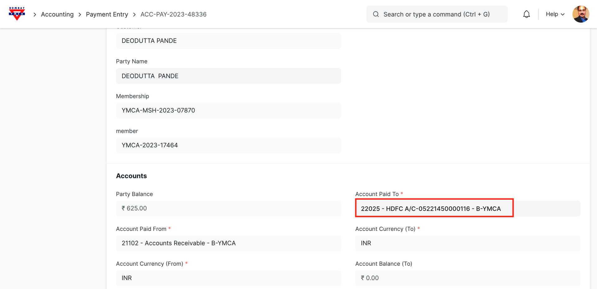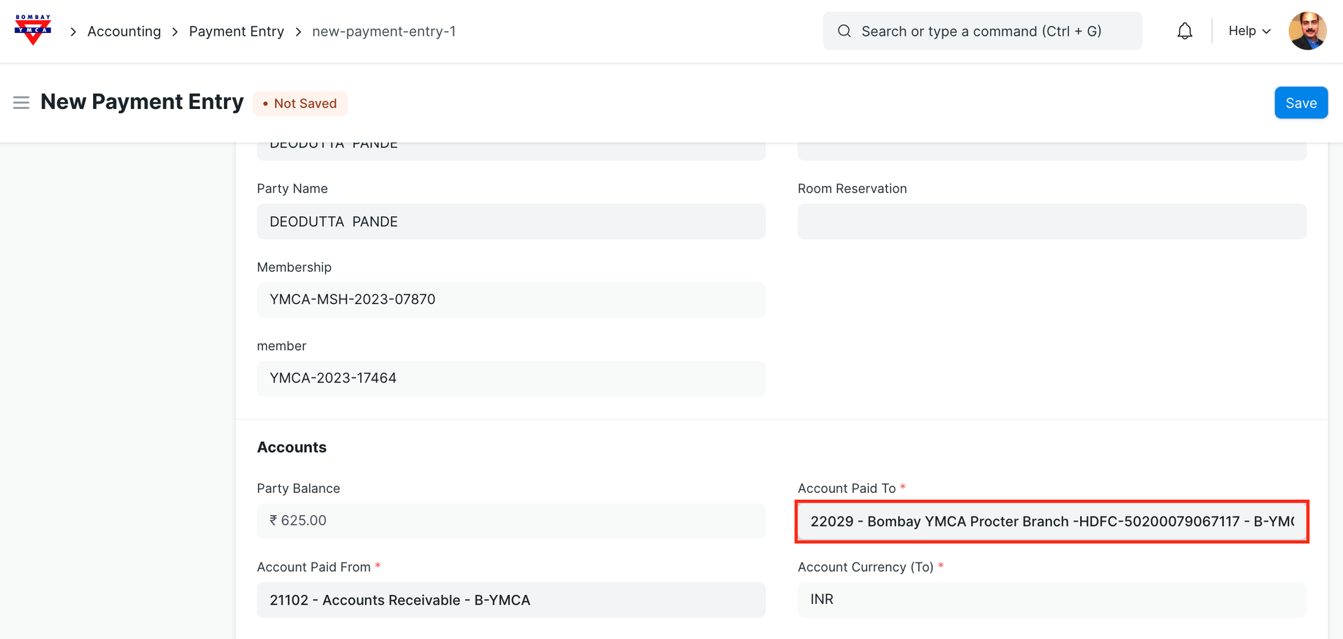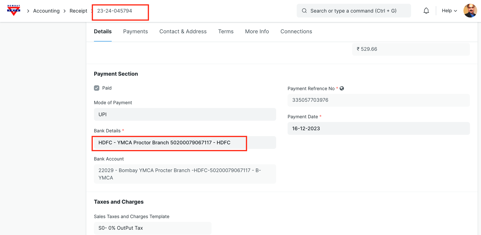 Bombay YMCA - How to Change Wrong bank in Receipt