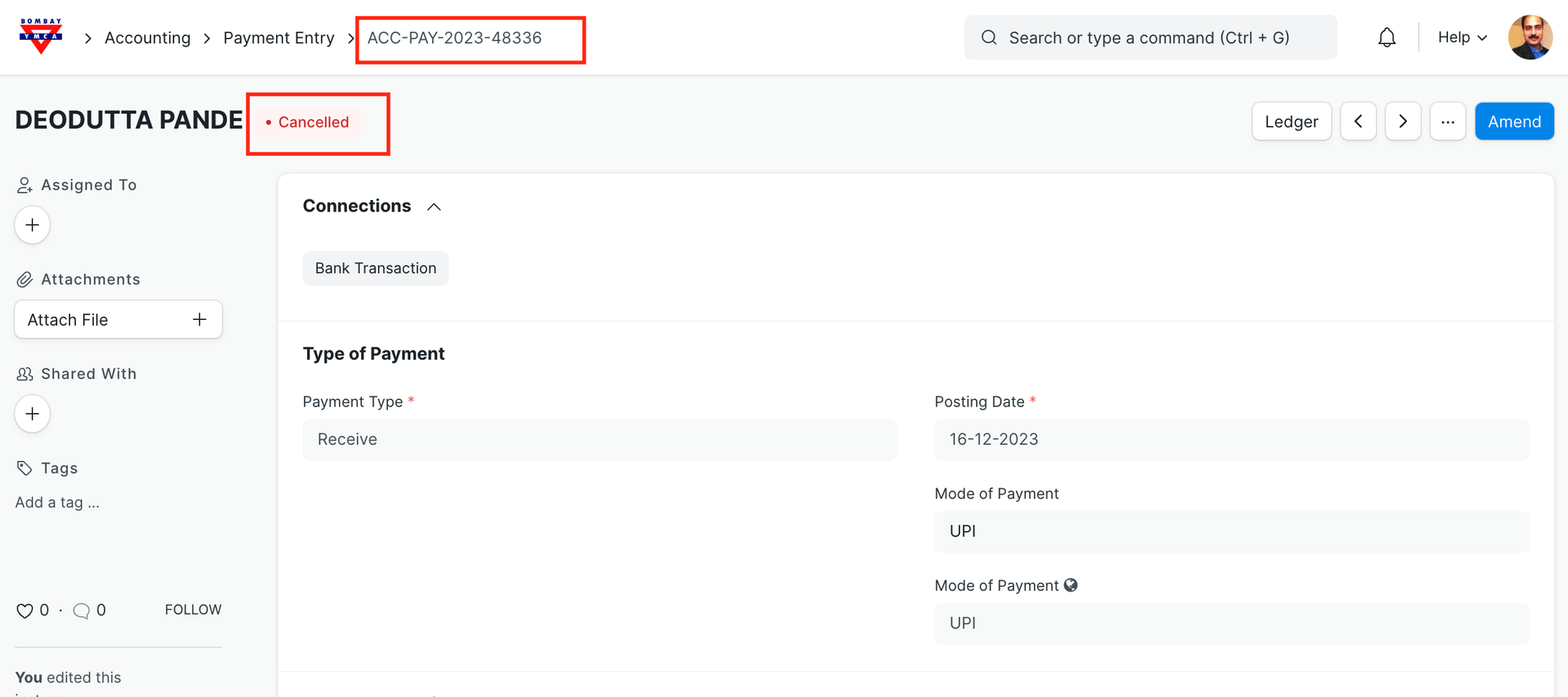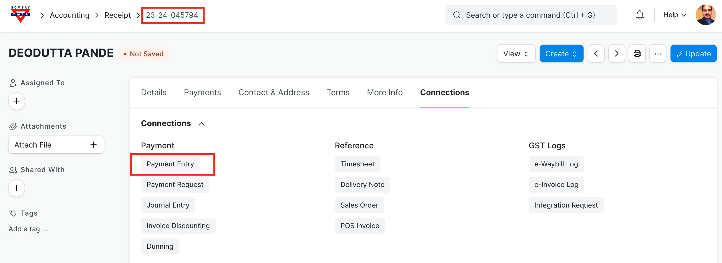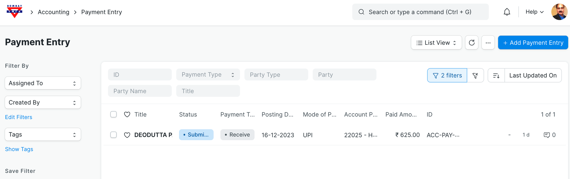 After submit of receipt, Payment entry is created in background. Now check the payment entry.