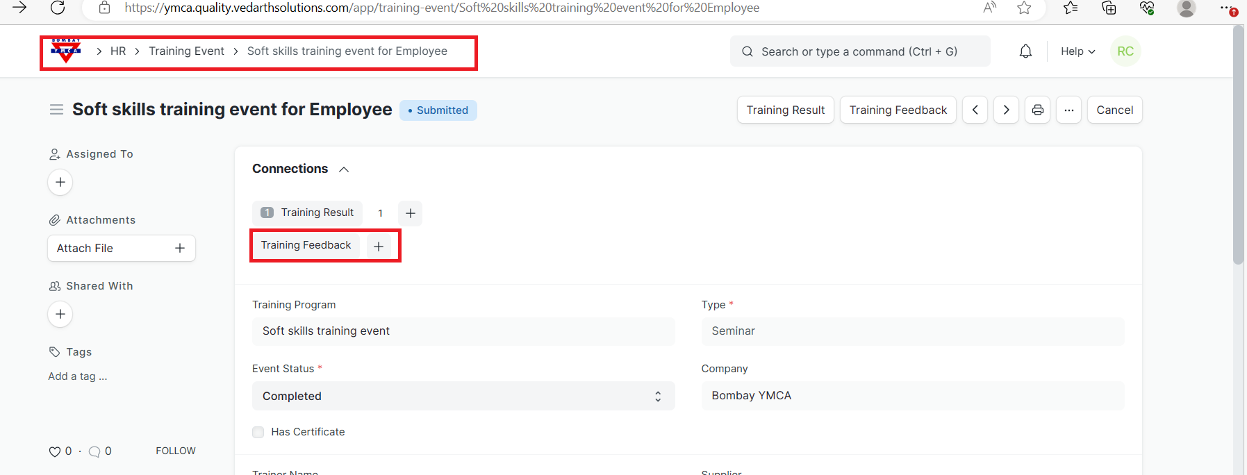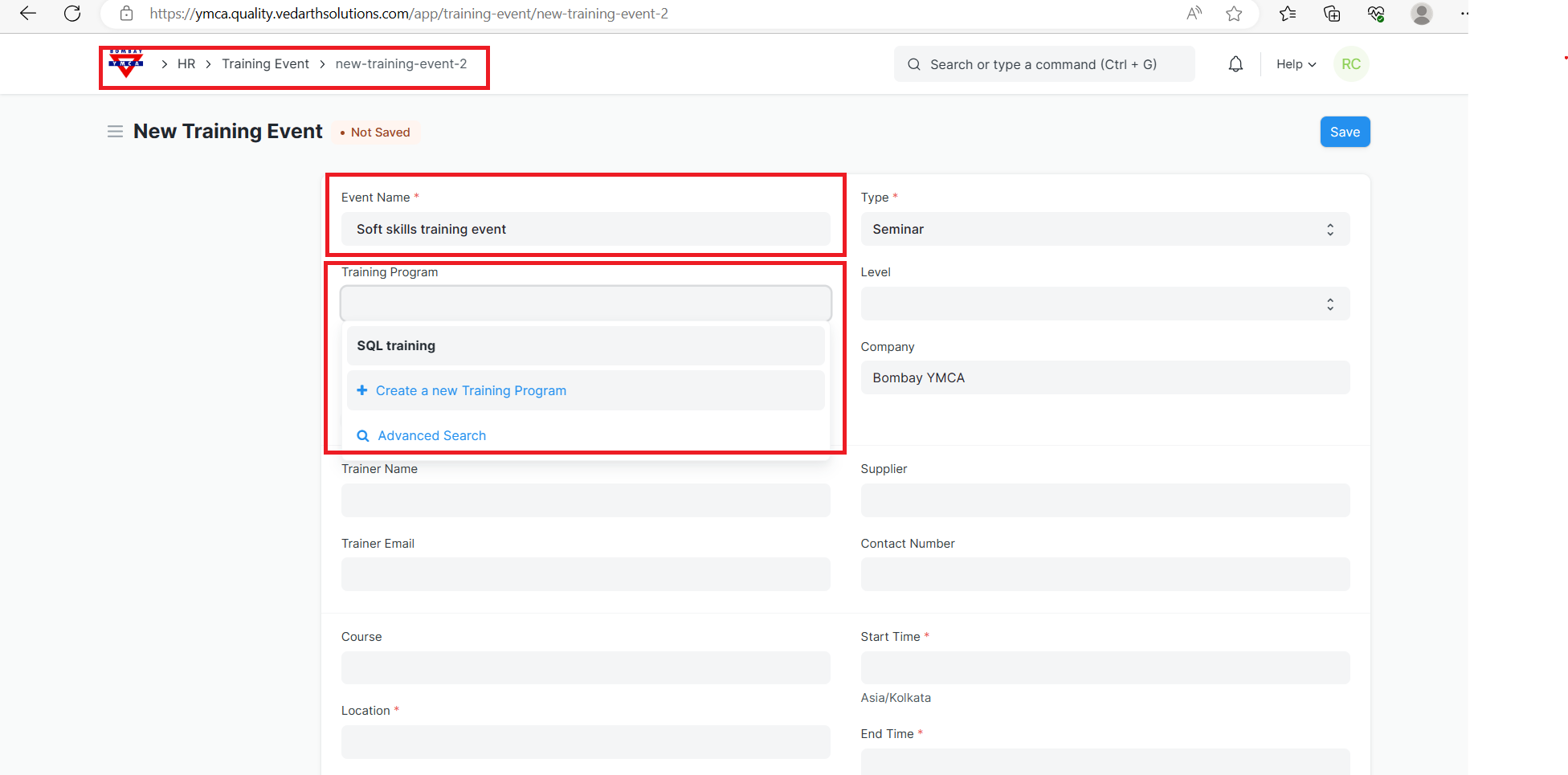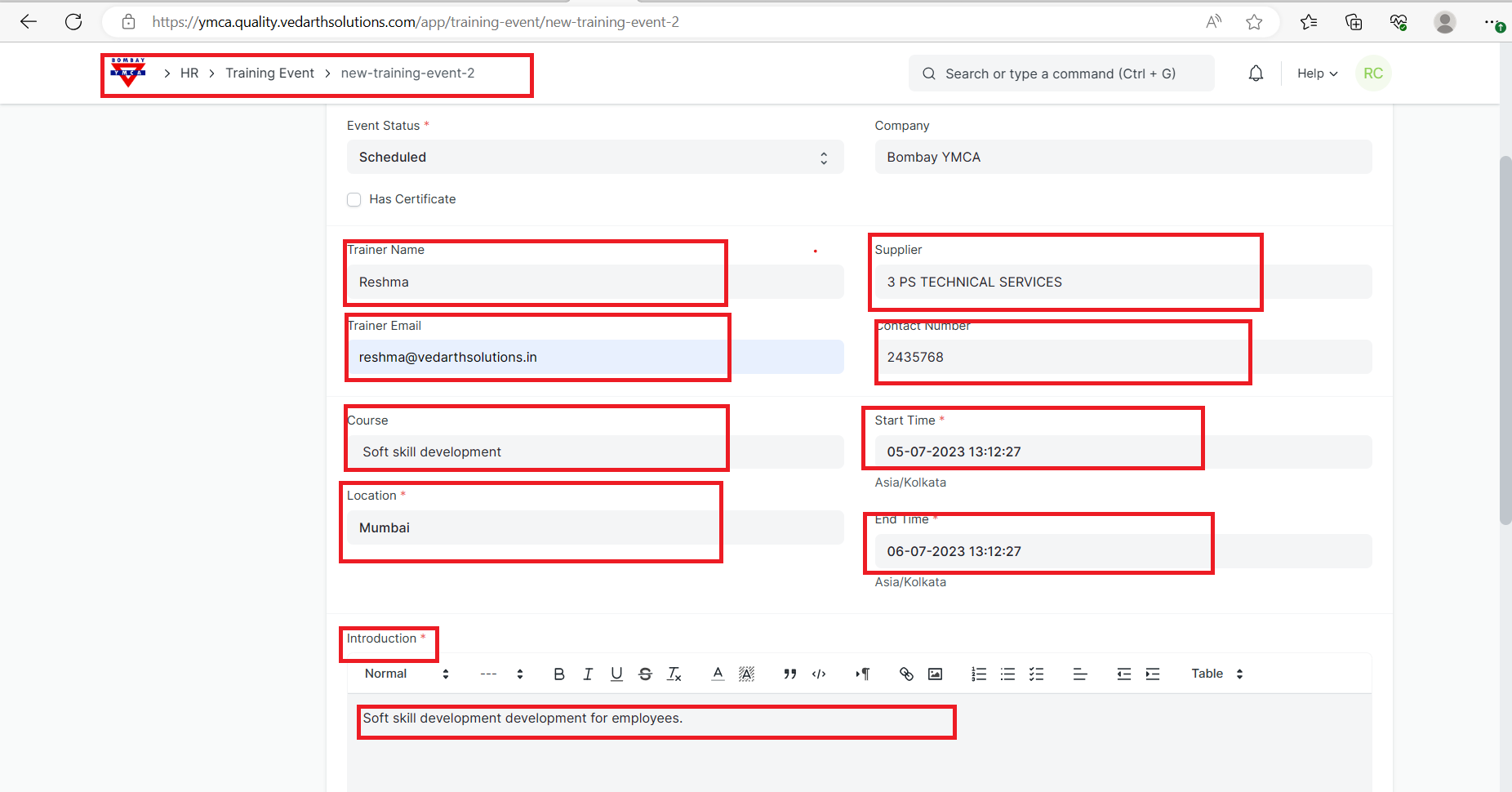 - Select the Training Event. Based on that, the corresponding Event Name, Course and Trainer Name will get fetched.