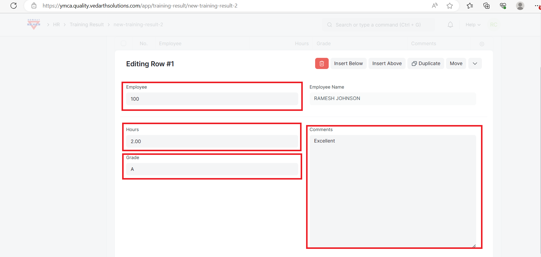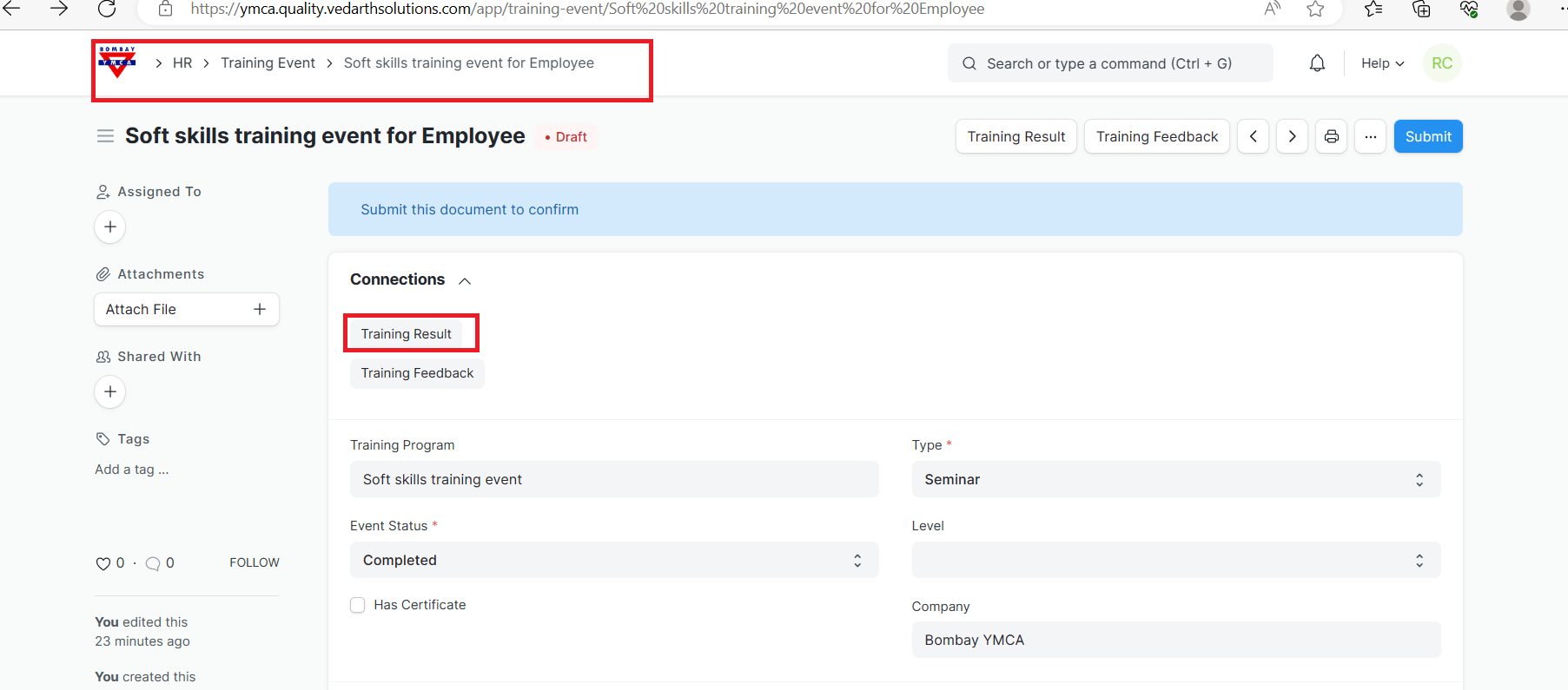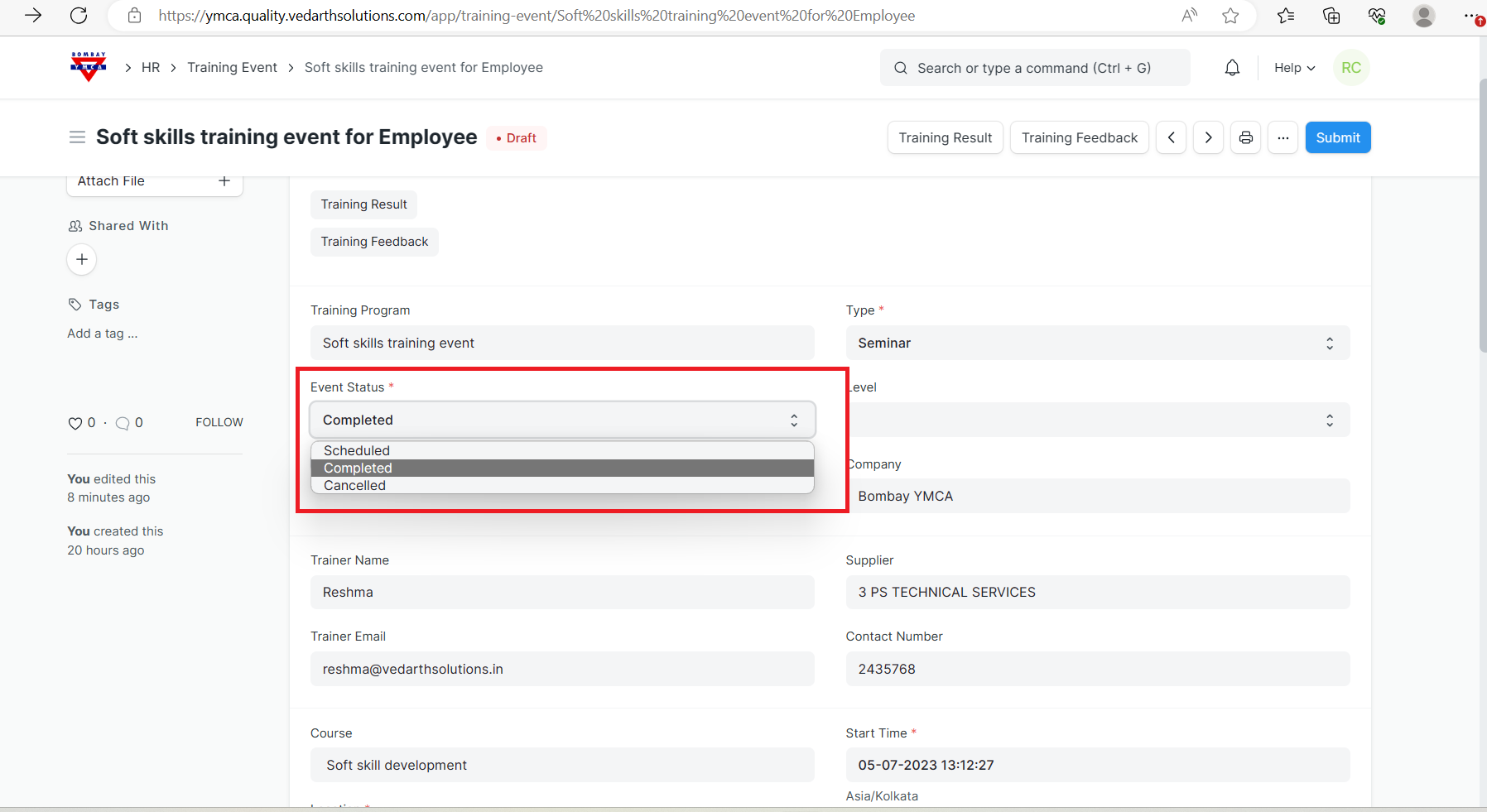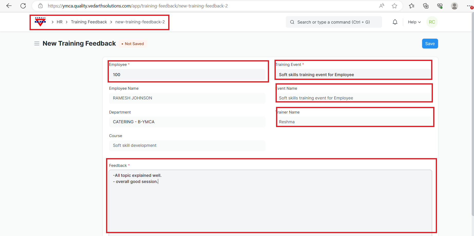 - Select the Training Event. Based on that, the corresponding Event Name, Course and Trainer Name will get fetched.
