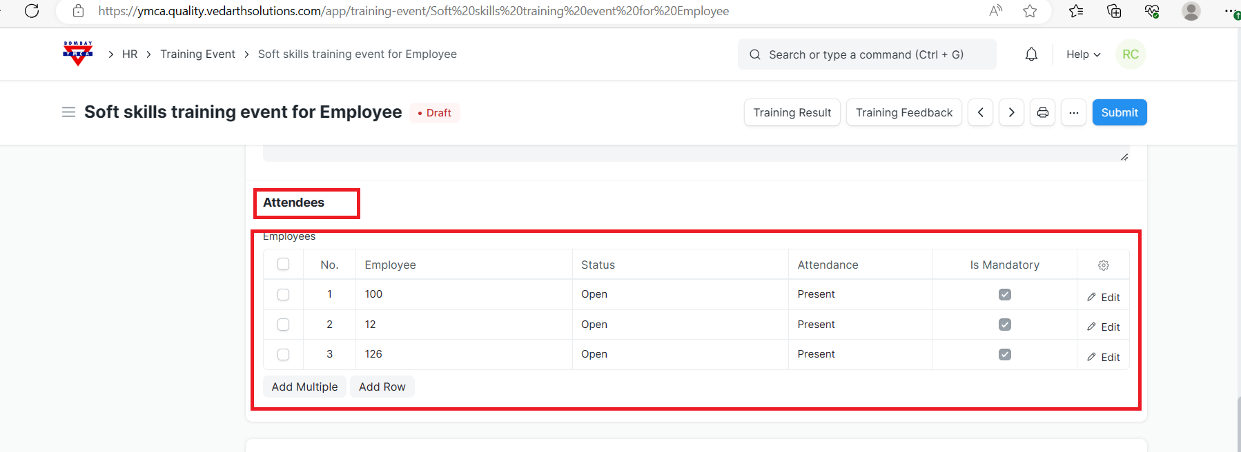You can invite your employees to attend the Training Event by selecting the employees to be invited in the Employees table.
