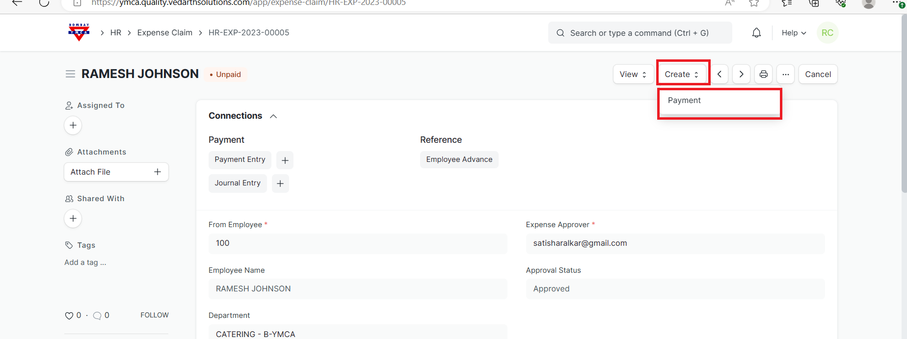 A] To make payment against the expense claim, user has to click on Create > Payment.