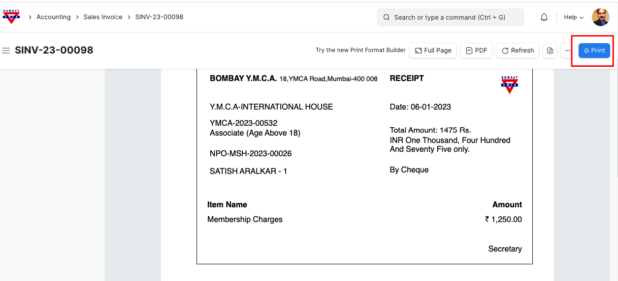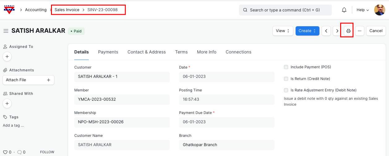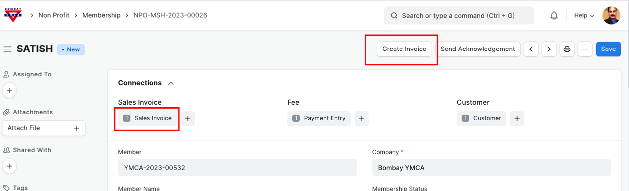 - New member will pay the amount and Branch staff will update the payment details in "Membership" document and will create "Sales Invoice".