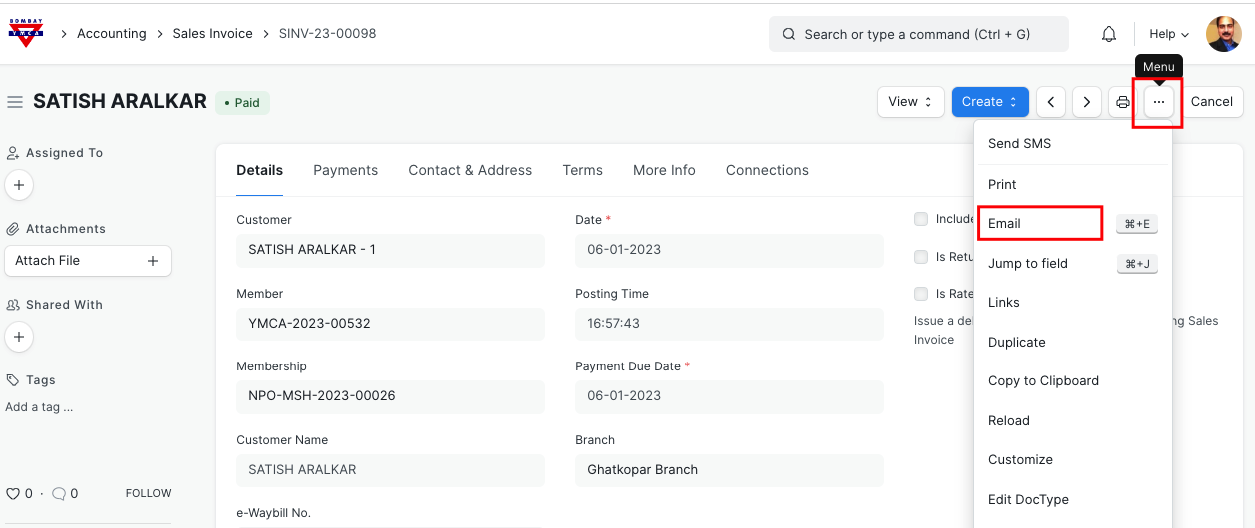 - Also you can send Payment receipt through Email. Go to Invoice and click on Email option.
