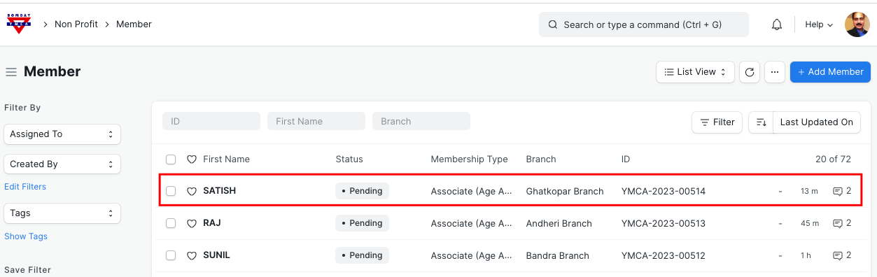 - After successful submission, form will go to respective Branch and saved as new member entry under "Member" document. Branch staff who is having approval authorisation will "Approve" the Member.