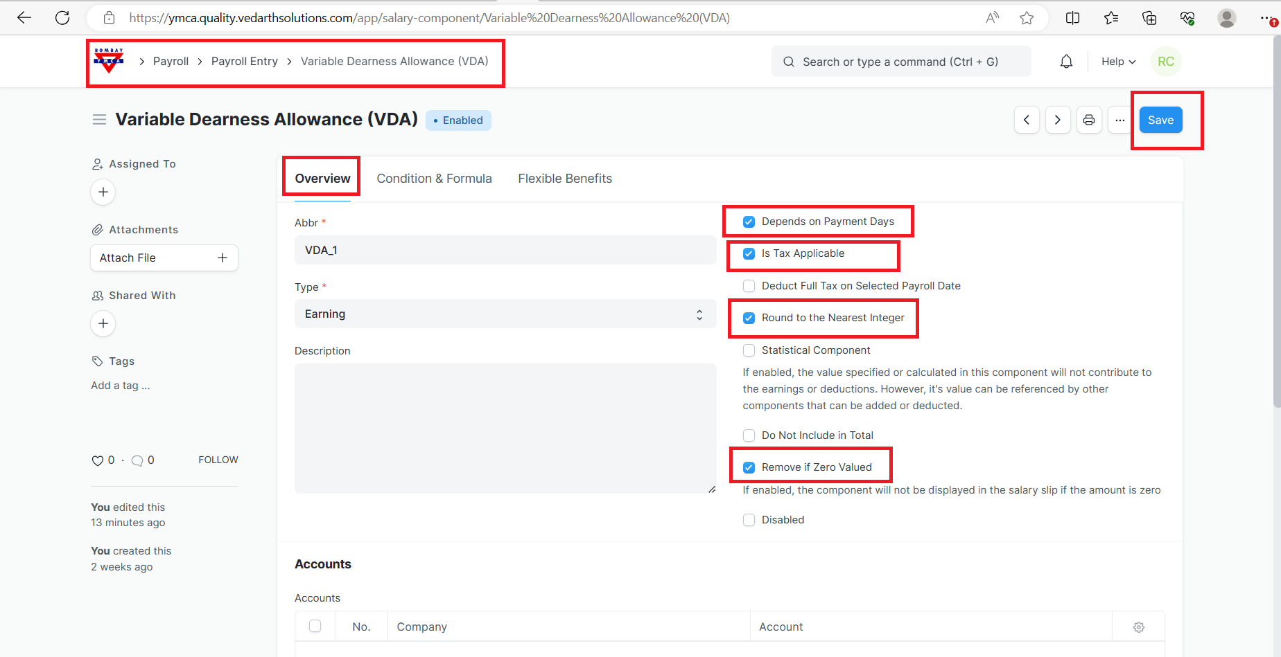 Bombay YMCA - VDA Component in salary Slip