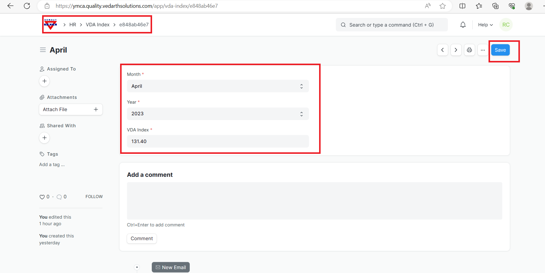 2] Go to the VDA index list > Add a month and year (from start date-salary slip) and add VDA index no. of that month and save it.