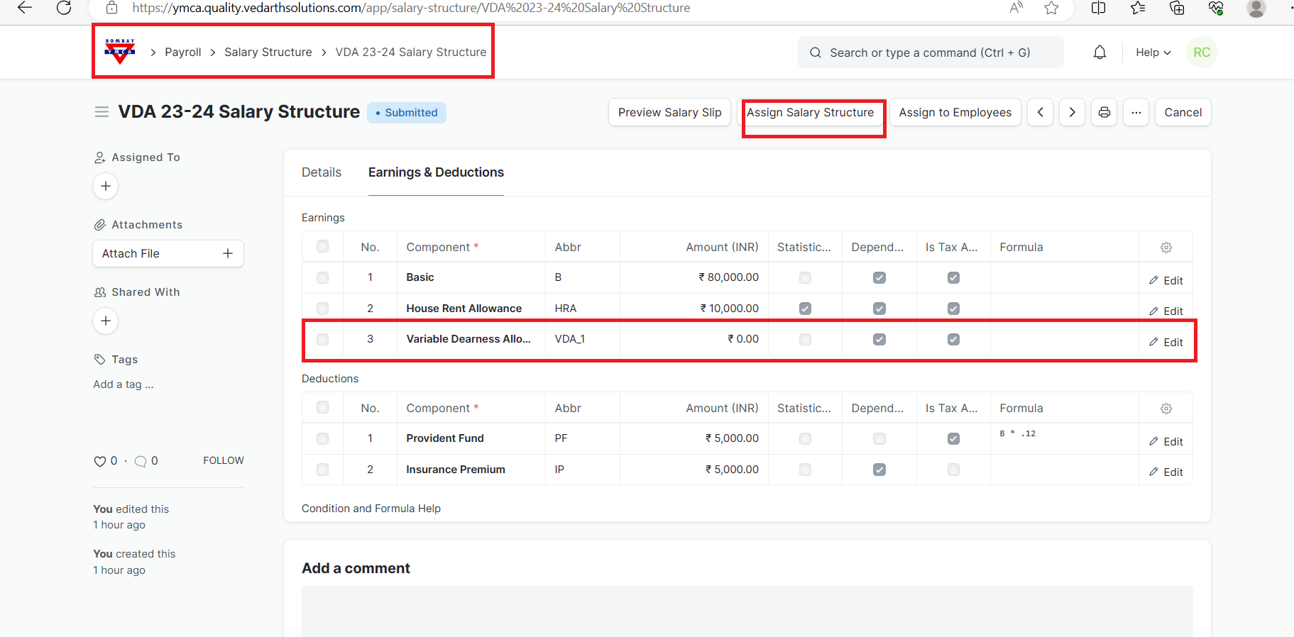 Make sure (VDA)salary component is created in the salary Component list.