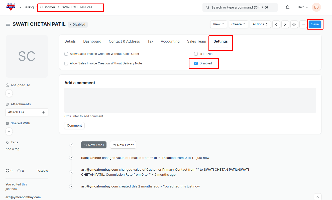 - In the Customer go to Settings Tab and check the Disable checkbox to disable the Customer and Save.