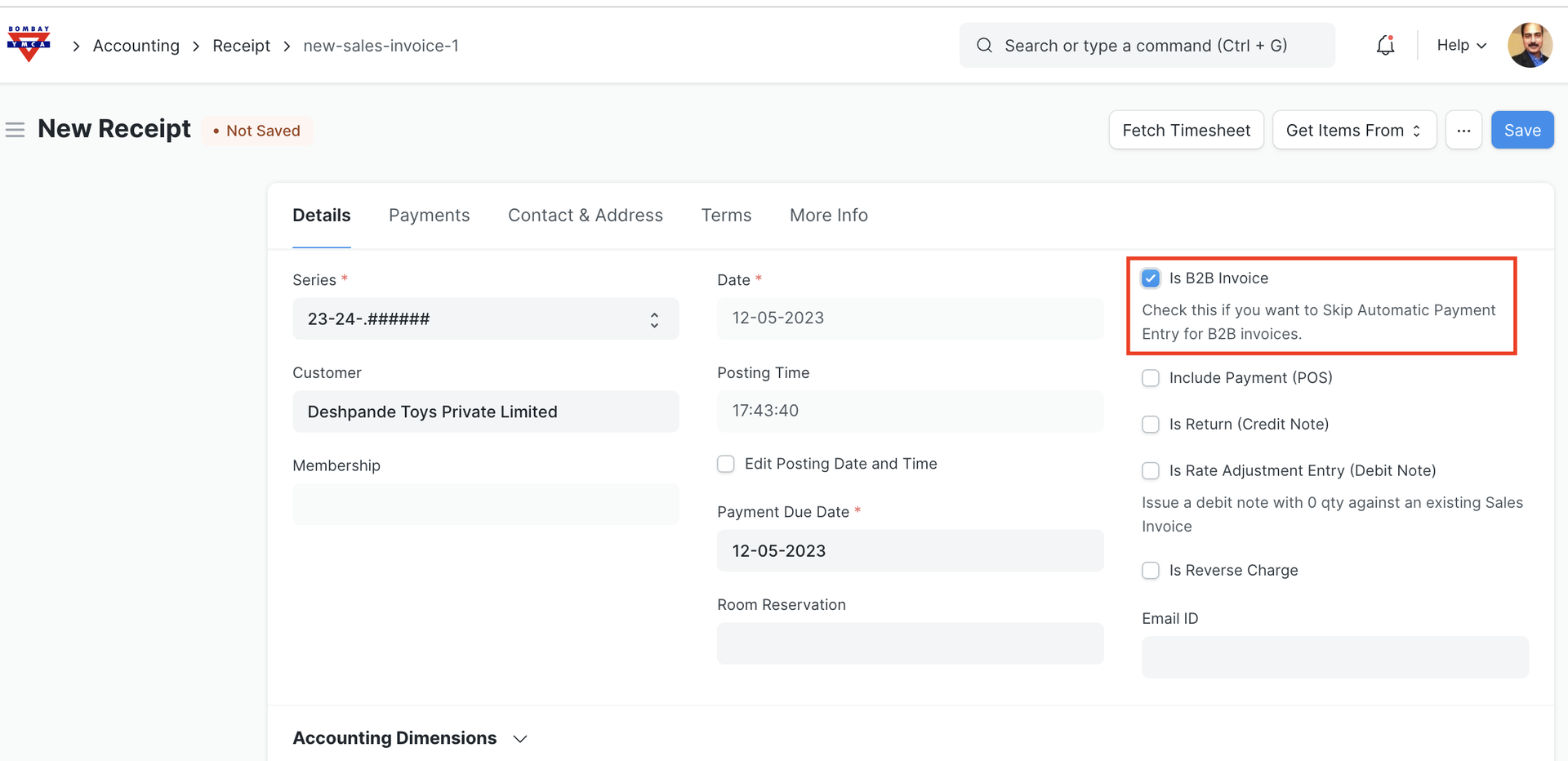 IntermediateB2B scenario : When you want to create an invoice for B2B customer and payment receipt is after creation of B2B invoice.