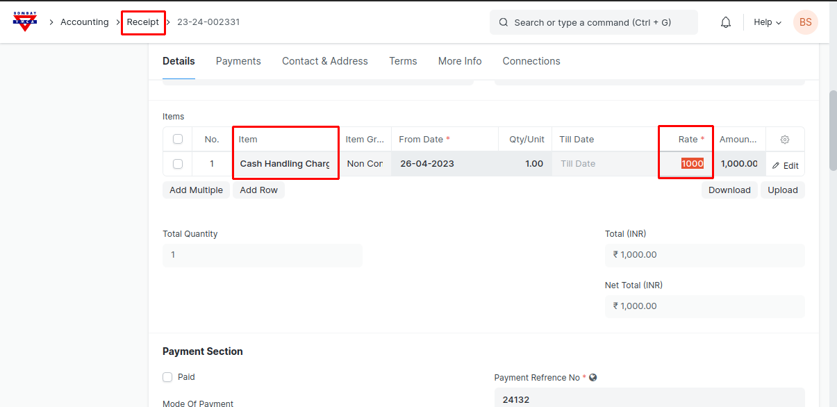 3) Fill all the required fields in the receipt form and add "Cash Handing Charges" Item to the items table in the Receipt, after save and submit, Receipt will get generated.
