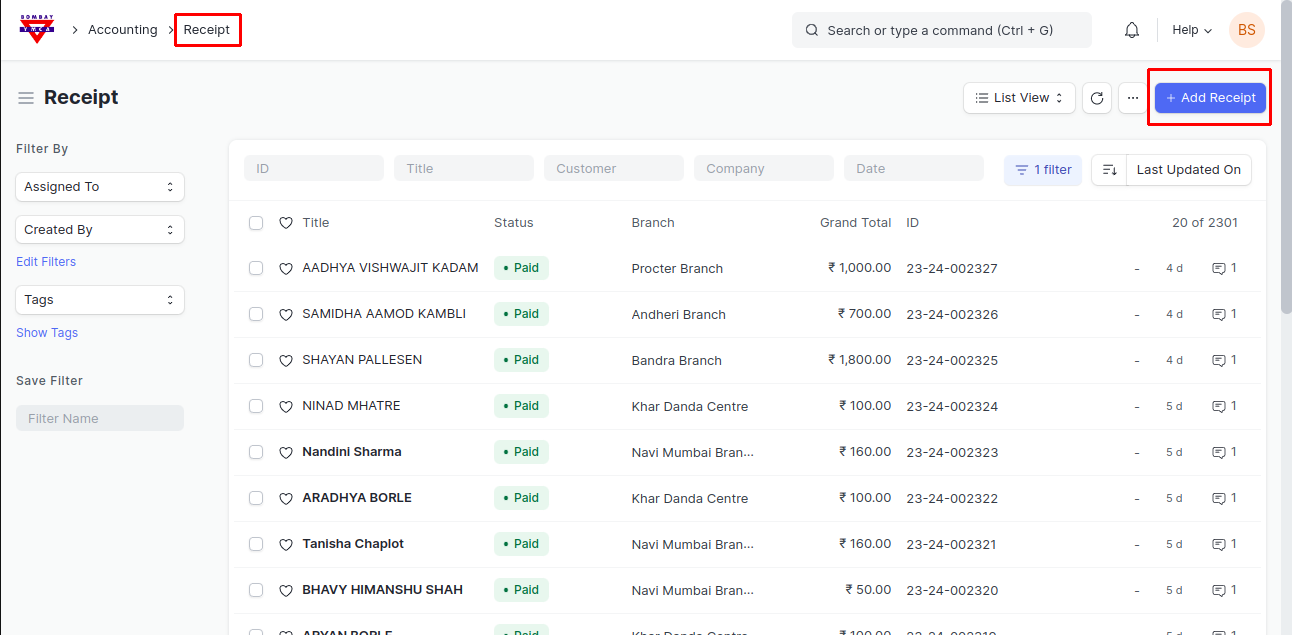 2) To make receipt of Cash Handling Charges, go to Receipt and create New Receipt
