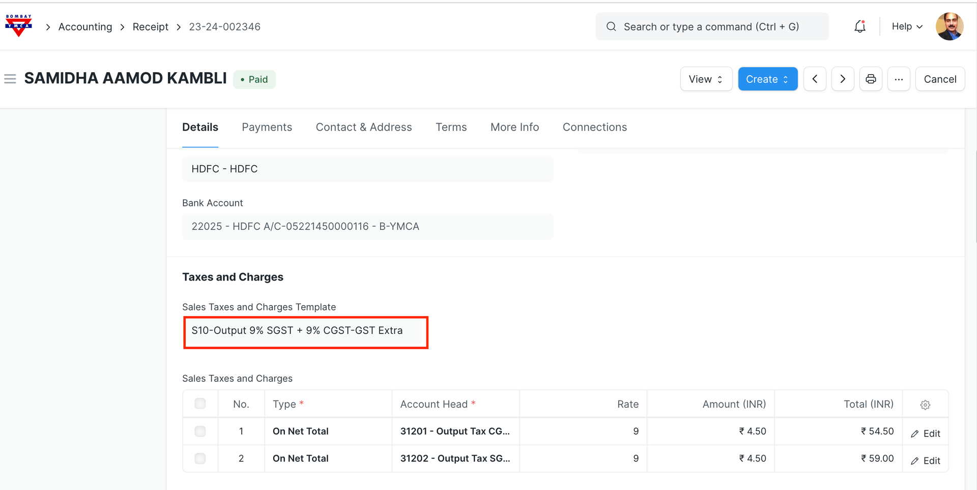 Bombay YMCA - Cash Handling Charges Receipt