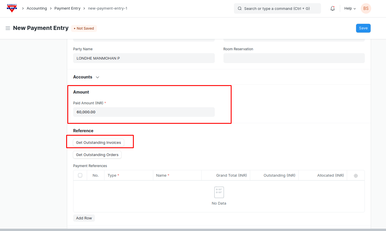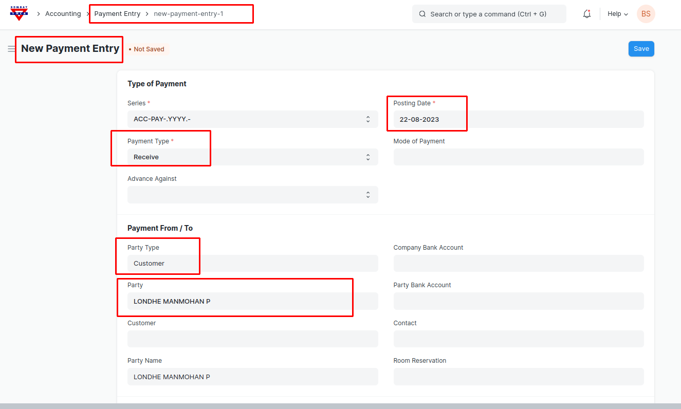 - Make a "New Payment Entry". Select a Party Type and Party.