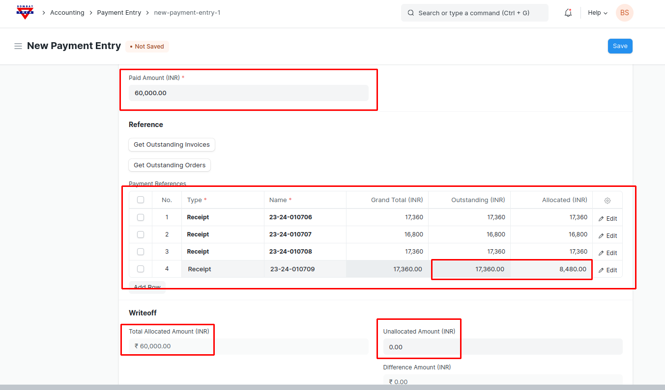 - Note : If in case customer paid more or less you can adjust the amounts and allocate accordingly to the receipts. There is an Allocated column next to outstanding amount column where you can allocate the paid amount to different Receipts.