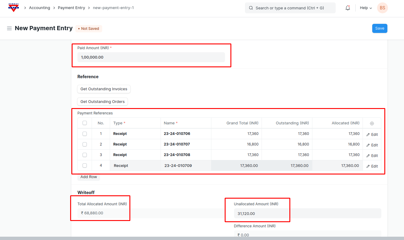 - If the Customer Paid the Excess amount than total outstanding amount of all unpaid/overdue receipts. Then put the paid amount in Paid amount field, get the outstanding Invoices, the amount will automatically get allocated to each receipt and remaining amount will go in the Unallocated amount as an advance.
