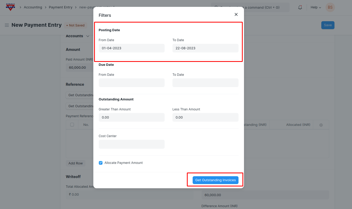 - Enter the Payment Amount paid by the Customer and Click on Get Outstanding Invoices Button.