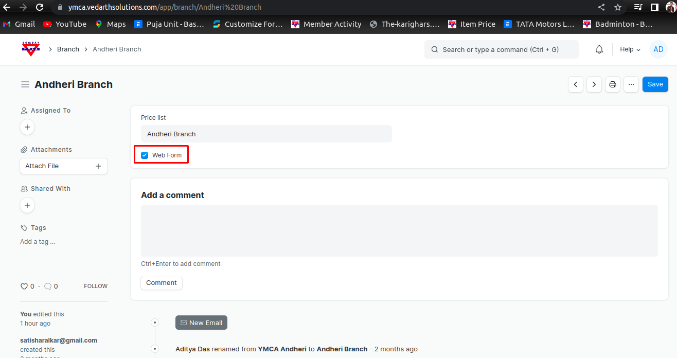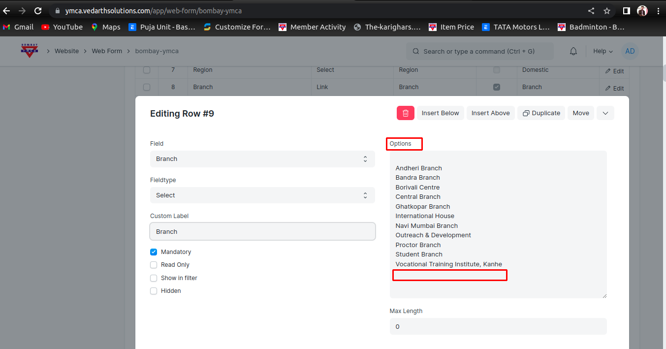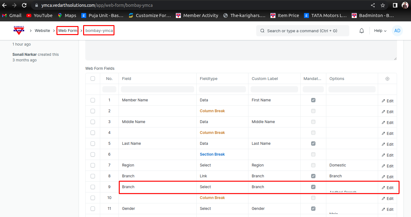 3 ) Then Go to Web Form - selelct Bombay YMCA web form - Edit Branch Option