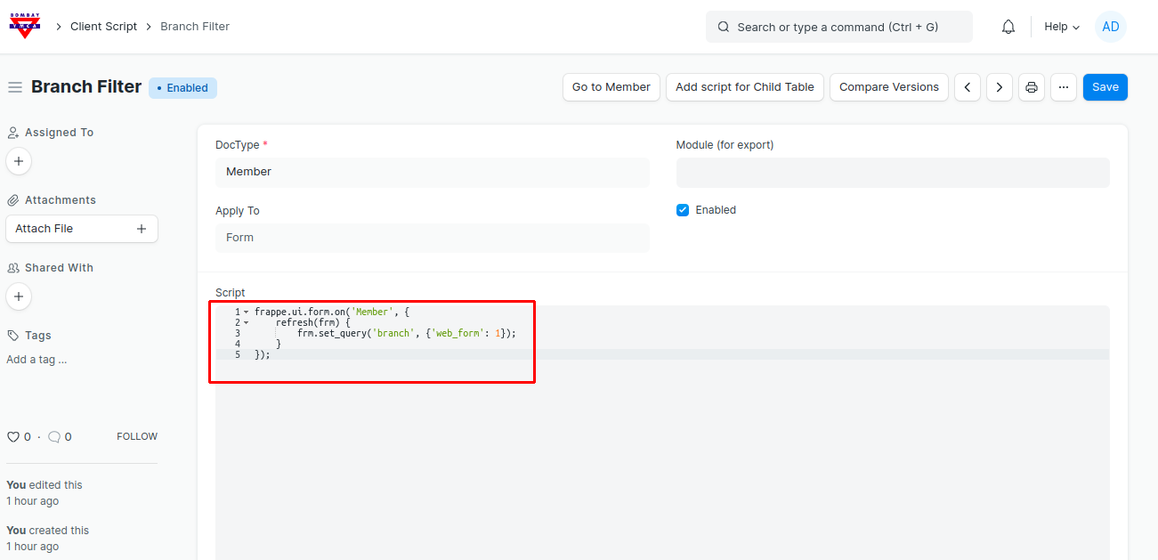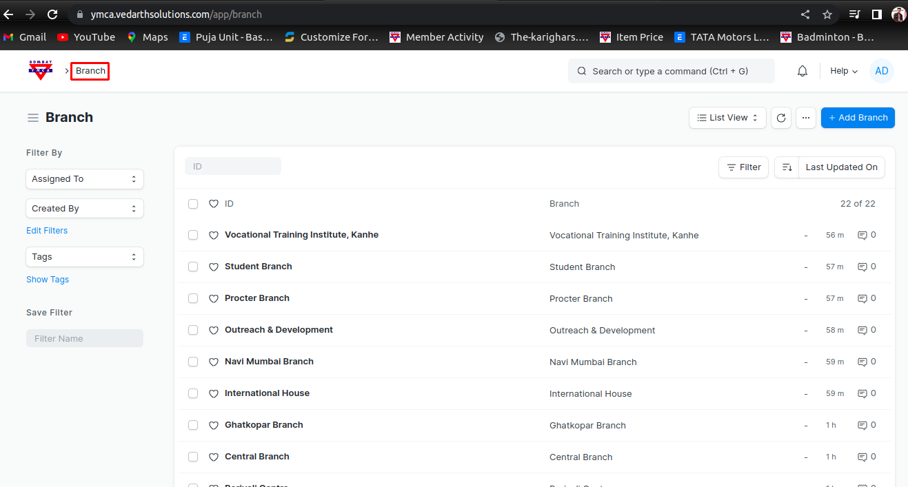 Bombay YMCA - Branch Filter development in Member